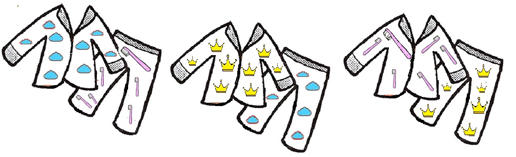 Outra atividade, que utiliza a ideia de raciocínio combinatório da multiplicação, solicita que a turma escolha três diferentes estampas para os pijamas. As estampas podem ser aquelas mostradas na história ou outras criadas pelos alunos. Sejam, por exemplo, as estampas de coroa (pijama do leão), nuvem (pijama da girafa) e escova de dente (pijama do jacaré). Os alunos deverão descobrir quantos pijamas, formados por calça e camisa, podem ser criados utilizando estas estampas. No total são 9 possibilidades e 3 delas são mostradas abaixo.
