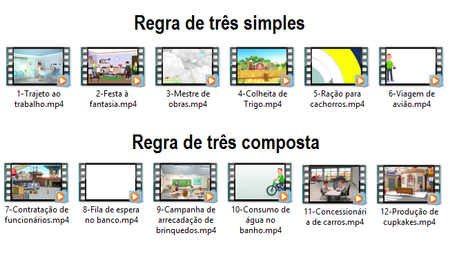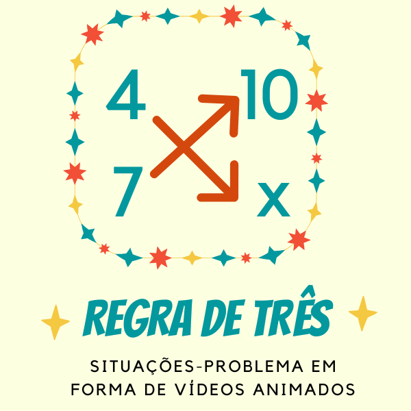 Foi pensando nisso que criei 12 vídeos curtos, com cerca de 1 minuto de duração cada, para auxiliar na aprendizagem da regra de três. Seis vídeos envolvem problemas que são resolvidos por regra de 3 simples e outros 6, por regra de três composta.