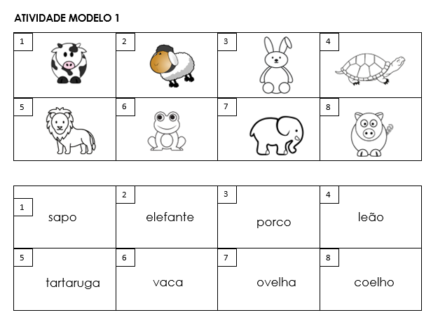 2) Quando todos os estudantes estiverem com os seus jogos prontos, o professor proporá a ATIVIDADE MODELO 1 para explicar o funcionamento do mesmo (treino). A atividade modelo deverá estar projetada em um telão para facilitar o entendimento. Ela consiste em fazer corresponder a imagem à palavra que a descreve.