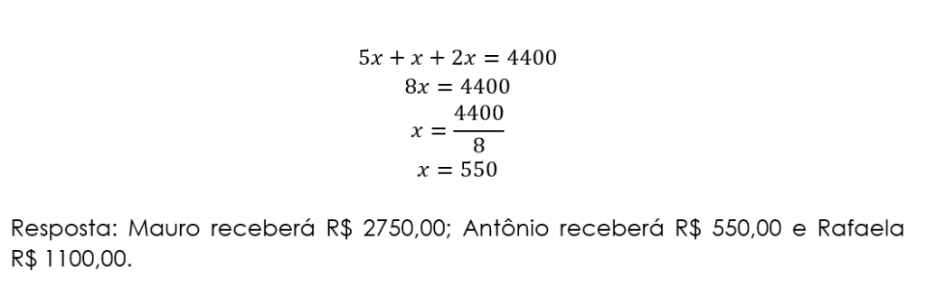 Este vídeo conta a história do Mauro, que é um pedreiro de mão cheia. Ele e seus amigos, Antônio e Rafaela fizeram um serviço extra e vão receber o mesmo valor por dia. Mauro trabalhou 5 dias, Antônio 1 dia e Rafaela 2 dias. O valor total que os três receberão é R$ 4400,00. Qual é a parte que cabe a cada um?